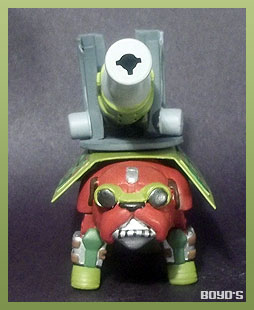 Bulldog Battle Beast is made from a repainted Lockjaw Minimate. His head has been modified, and given protective goggles and a nifty bomb emblem with Sculpey. He's wearing boots from Titanium Man Minimates. His armored shell is made from cut plastic, carefully glued together and painted. His gun is made from a toy bazooka, with additional details made from cut plastic and a couple of small plastic caps. The gun was then mounted to a round Minimate stand, carefully painted, then attached to the armored shell.