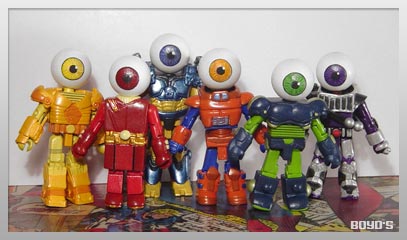 Back when I was working on the three robot Minimates for this year's auction, I came up with a fourth Minimate - a robot with a giant eyeball for a head. I'm not sure why - probably just inspired by characters like Optikk, the Orb and Oculus Orbus. But as I was thinking about him, I also came up with the parts for a second eyeball robot. And then a third. And soon, I had a whole squad of these planned out. And a back story for them as well...